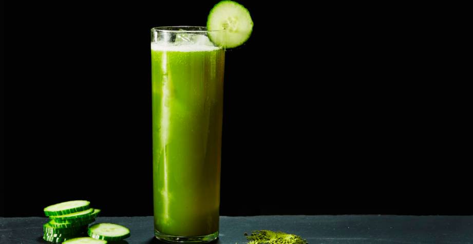在科林斯杯中倒入伏特加,冰塊,糖漿和并抹茶,澆上蘇打水后進(jìn)行攪拌,并用黃瓜片裝飾。