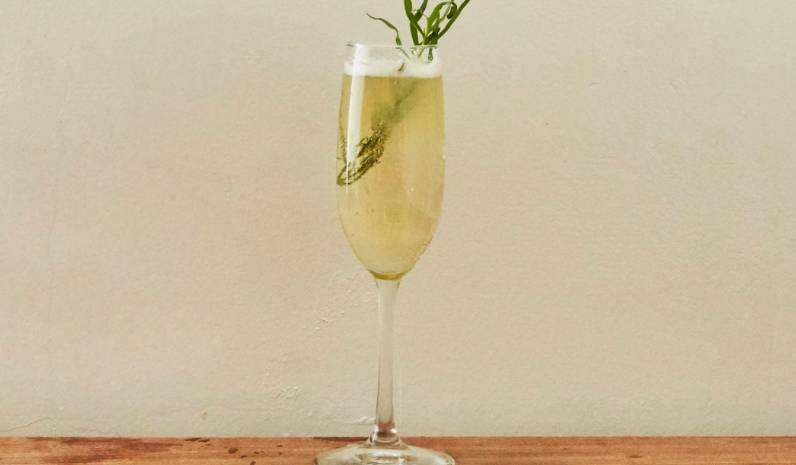 在香檳杯中倒入桃味利口酒和蘇士酒,澆上Prosecco,并用龍蒿葉做裝飾。