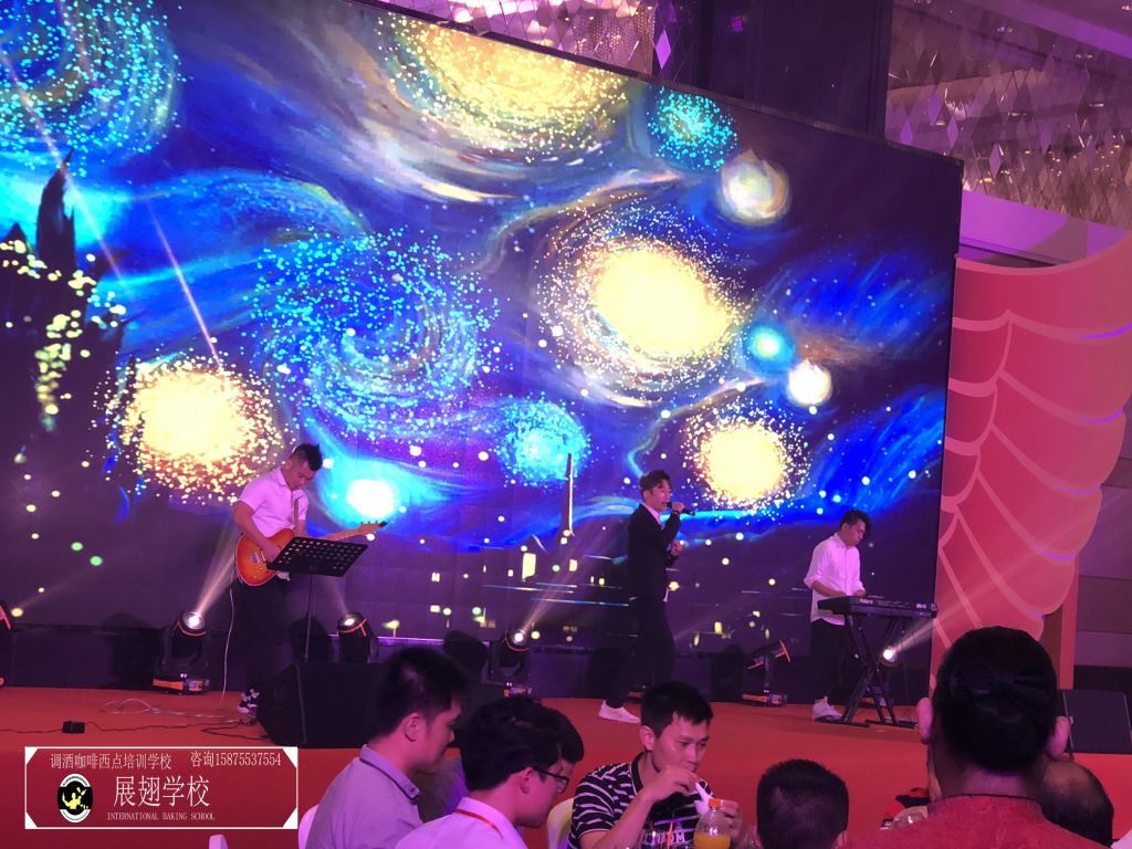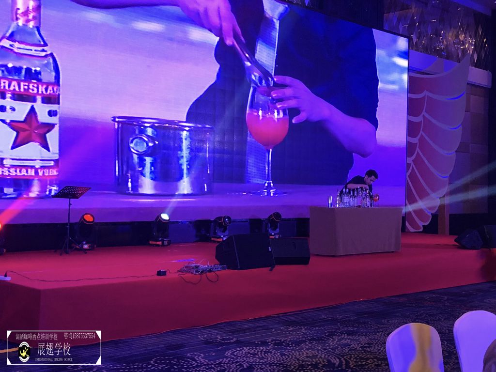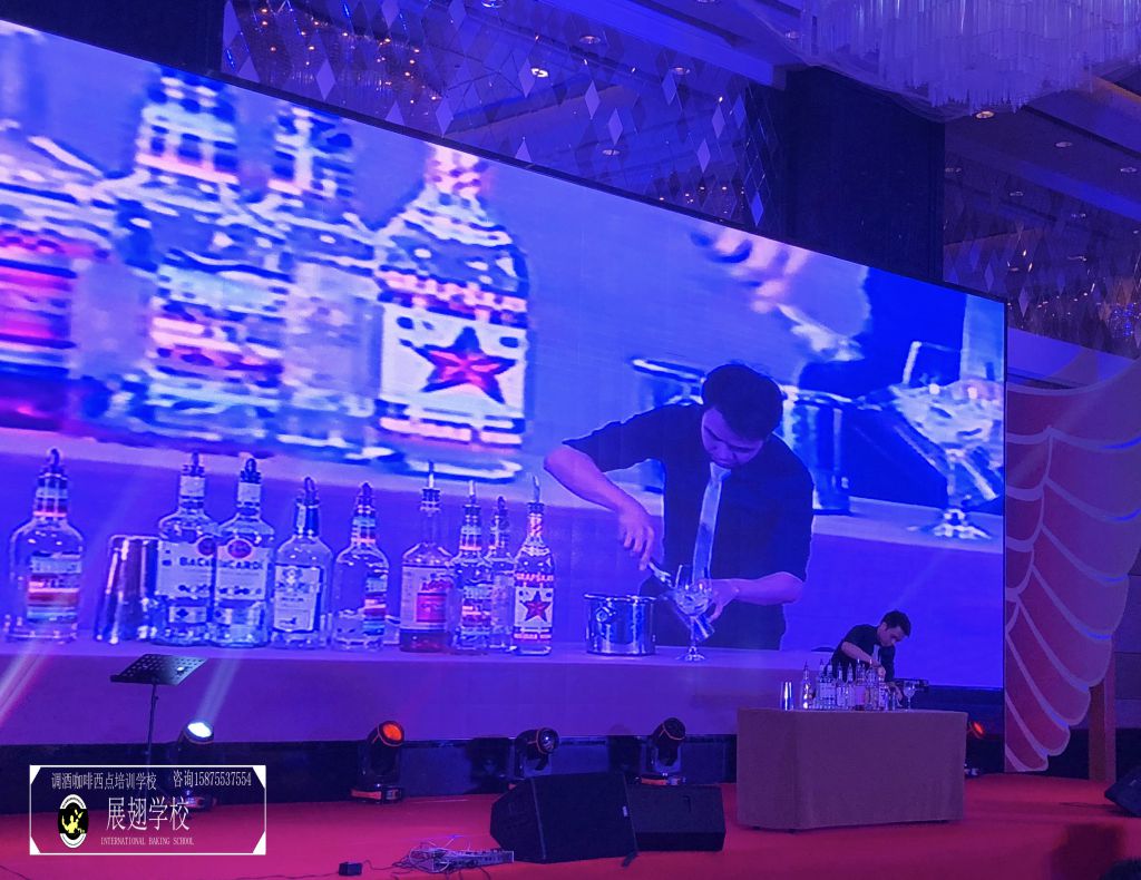 不多時,全場佳肴已近杯盤狼藉,賓客們帶著點疲倦,會議氣氛一時走入低谷。瞬間,滾動性極強的音樂使得全場目光都投注到大屏幕上,佛山展翅咖啡調酒西點培訓學校的花式調酒師張韋杰先生已經登場。張韋杰先生前面的桌上擺放著七八瓶不同款式的酒,少許調酒工具,和一只雞尾酒酒杯。全場帶著好奇的目光盯著臺上:能調出什么顏色的酒?