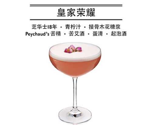 隨著玫瑰花蕾氤氳開來的是威士忌隱隱的芬芳花香,原本的濃烈不羈被接骨木花糖漿和起泡酒柔化開去。皇家榮耀是一款優雅而嬌美的雞尾酒。